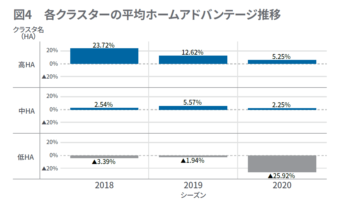 また、中HAクラスターは過去3シーズンのホームアドバンテージはプラスで推移しているものの、高HAクラスターに比べるとホームアドバンテージはわずかです。低HAクラスターについては、過去3シーズン通じてマイナスで推移しており、直近の2020年シーズンでは▲25.92%と大きく減少してしまっています。