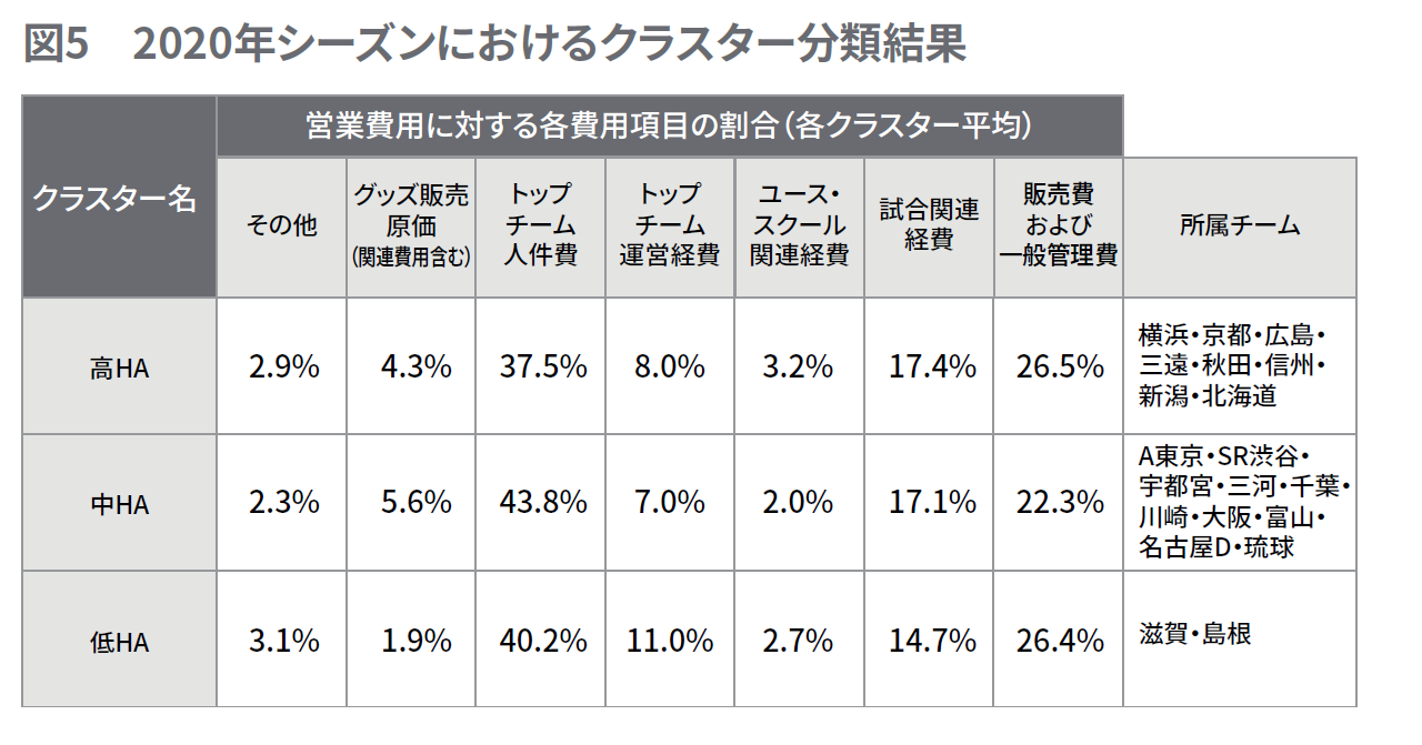 クラスターごとの費用項目の割合を確認すると、高HAクラスターはトップチーム人件費の割合が37.5%とほかのクラスターに比べると低く、対して販売費および一般管理費やトップチーム運営経費がやや高い割合を示しています。中HAクラスターはトップチーム人件費と試合関連経費の割合がやや高く、この2つの費用項目で営業費用の6割強を占めています。低HAクラスターはトップチーム人件費と販売費および一般管理費で営業費用の6割以上を占め、ほかのクラスターに比べて試合関連経費やグッズ販売原価がやや低い割合になっています。