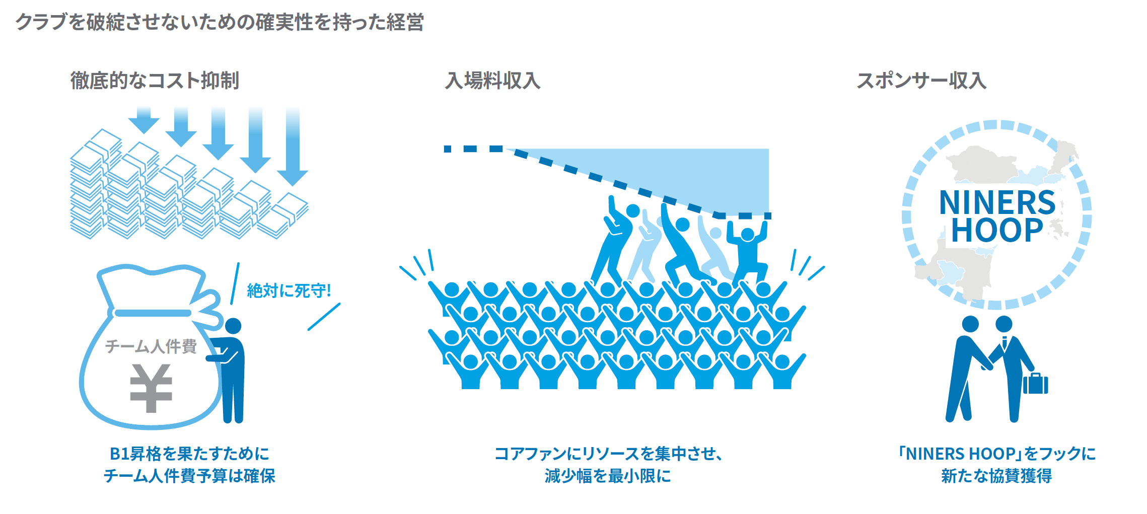 これまでは「トップライン(売上高)」の向上に主眼を置いた経営を行ってきましたが、コロナ禍2年目も見通しの立たない外部環境を踏まえ、渡辺氏は「クラブを破綻させないための確実性重視の経営」に一気に舵を切ることにしました。その際意識したのは、コストを徹底的に抑制しながら、コアとなるファン・ブースターとの関係をより強固なものとする、ということです。