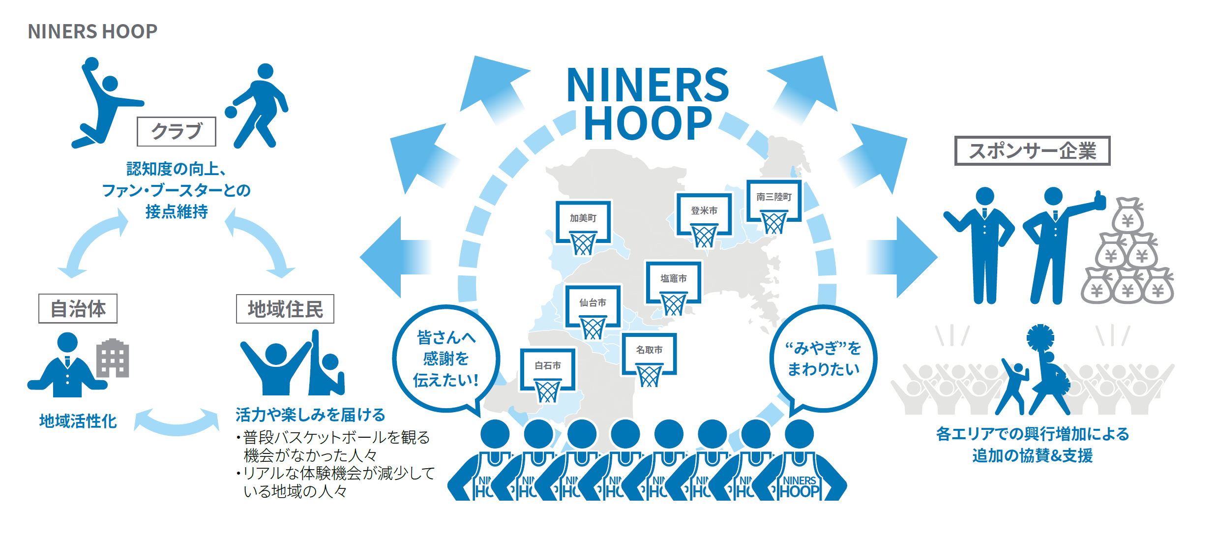 仙台市以外の各市町での積極的な興行開催自体は、ホームアリーナの使用ルールの緩和を受けた一時的な施策となりますが、「NINERS HOOP」の活動は今後もその理念を維持しながら、ファンや地域住民、企業、行政などをつなぐプラットフォームとして活動の幅を広げていく展望となっています。実際、ゼビオアリーナ中心の興行開催に戻った2021年シーズンにおいても、「NINERS HOOP」で接点を強化した各市町の企業の多くから協賛を継続してもらうことができているという興味深いお話も伺えました。
