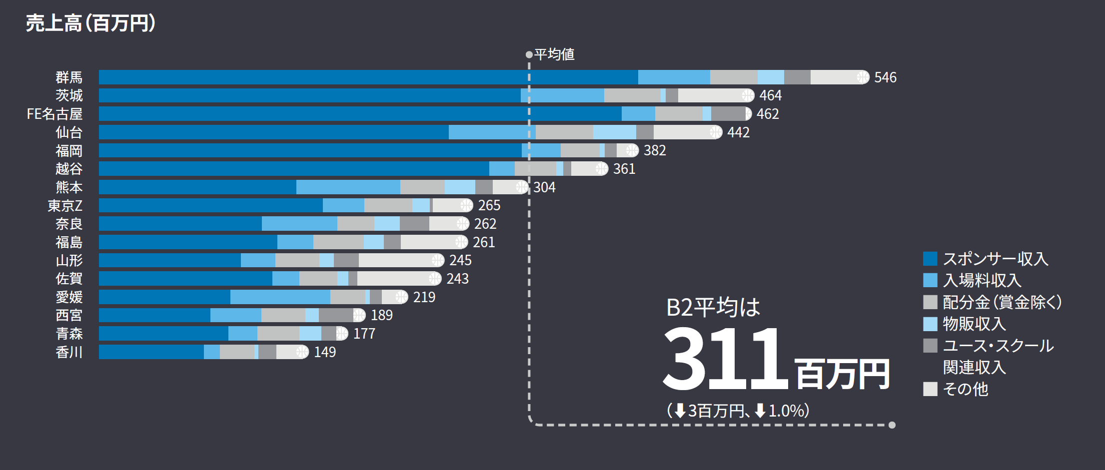 売上高トップの群馬は、入場料収入こそ昨シーズンから38百万円減少していますが、スポンサー収入、ユース・スクール関連収入を前年比で約2倍としており、全体としてプラス成長を達成しています。
