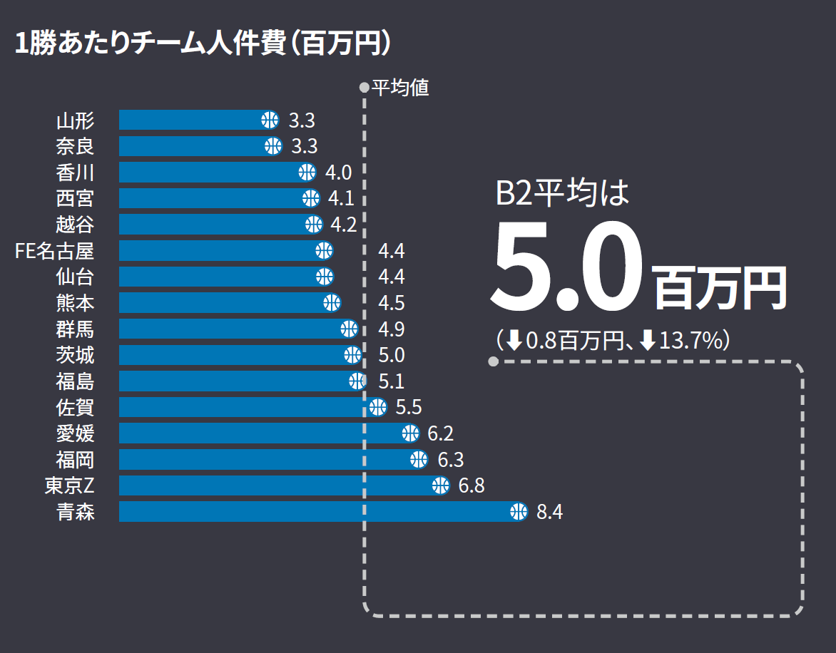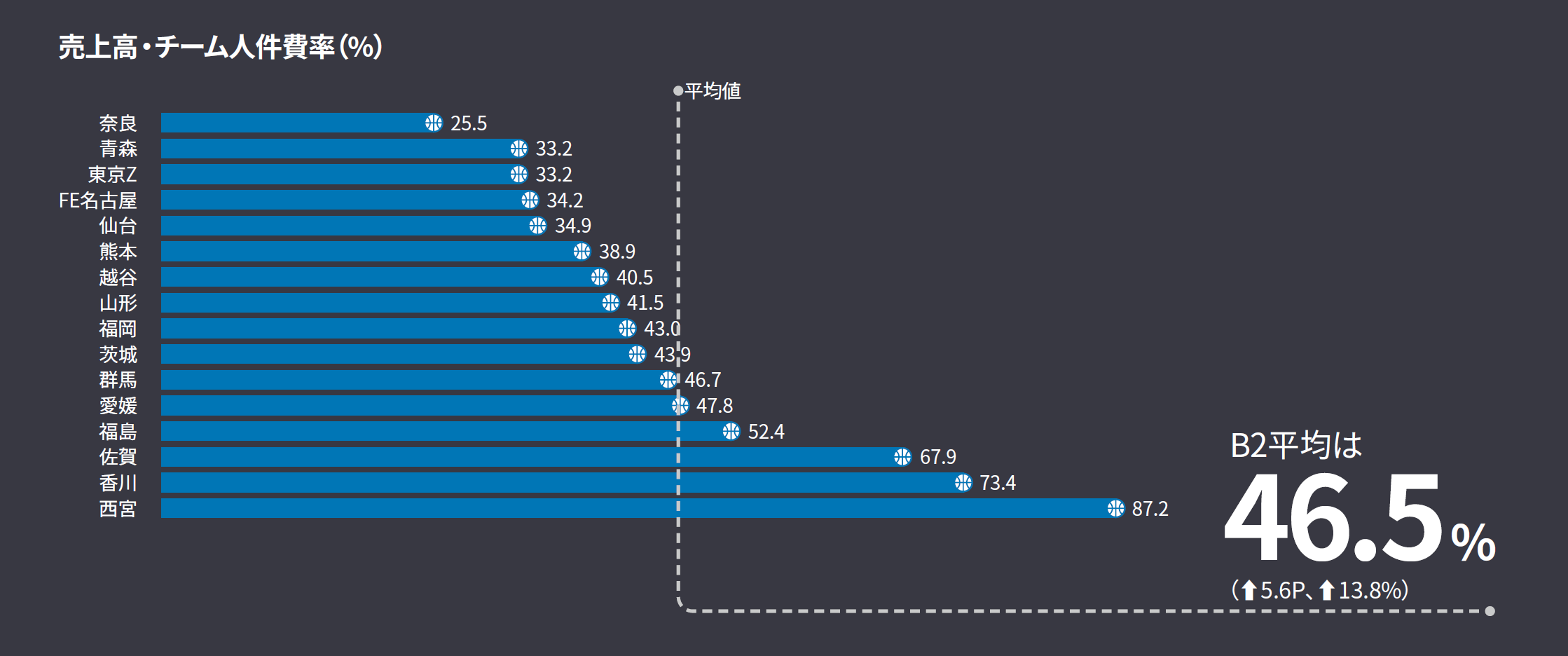 平均チーム人件費は+10百万円と前年と同程度の増加となりましたが、平均売上高が▲3百万円と、コロナ禍の影響を受けてBリーグ開幕後初めて減少に転じたことが要因です。