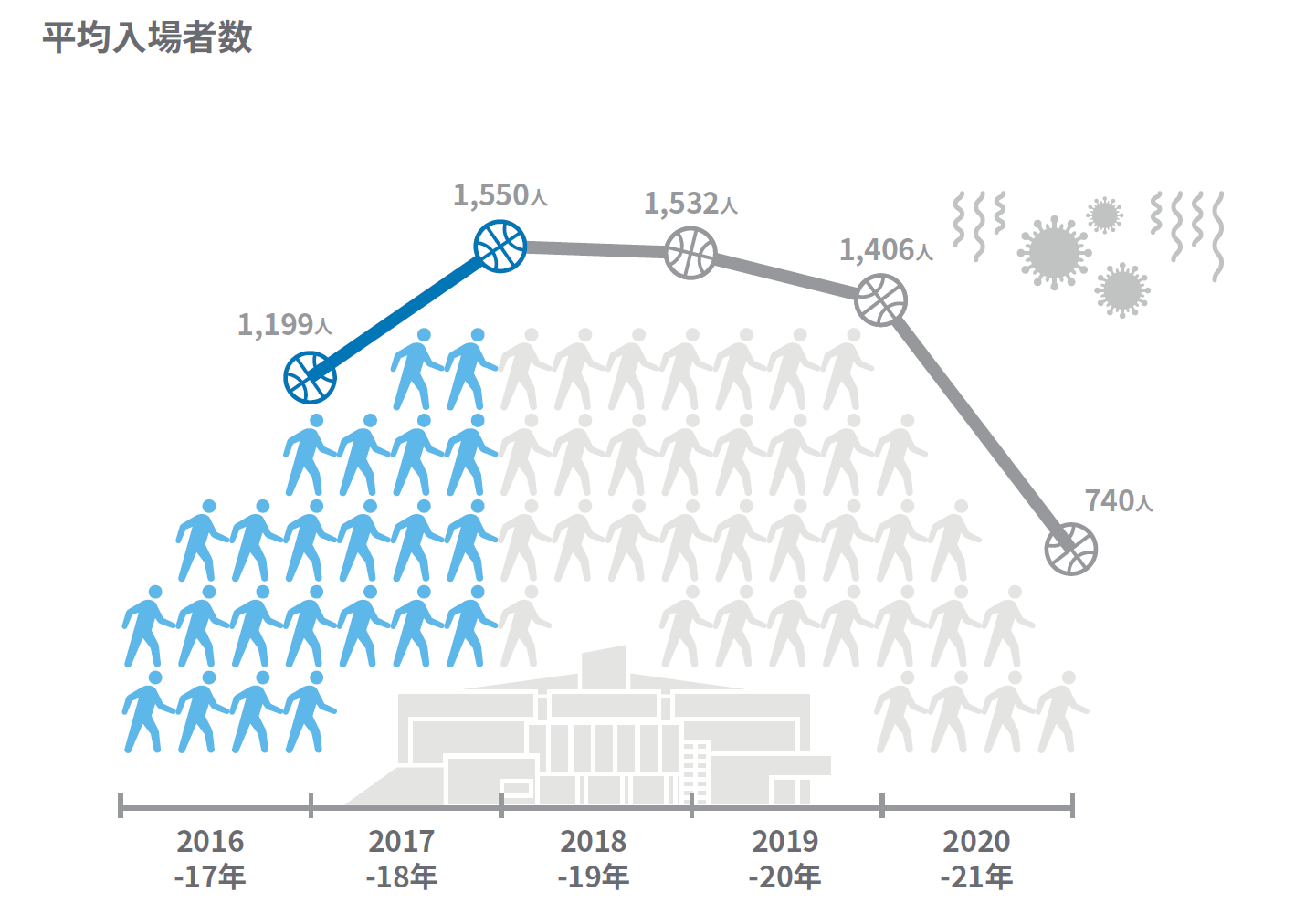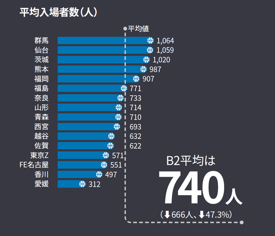 2020年シーズンにおけるB2の平均は前年比▲666人(▲47.3%)の740人となりました。