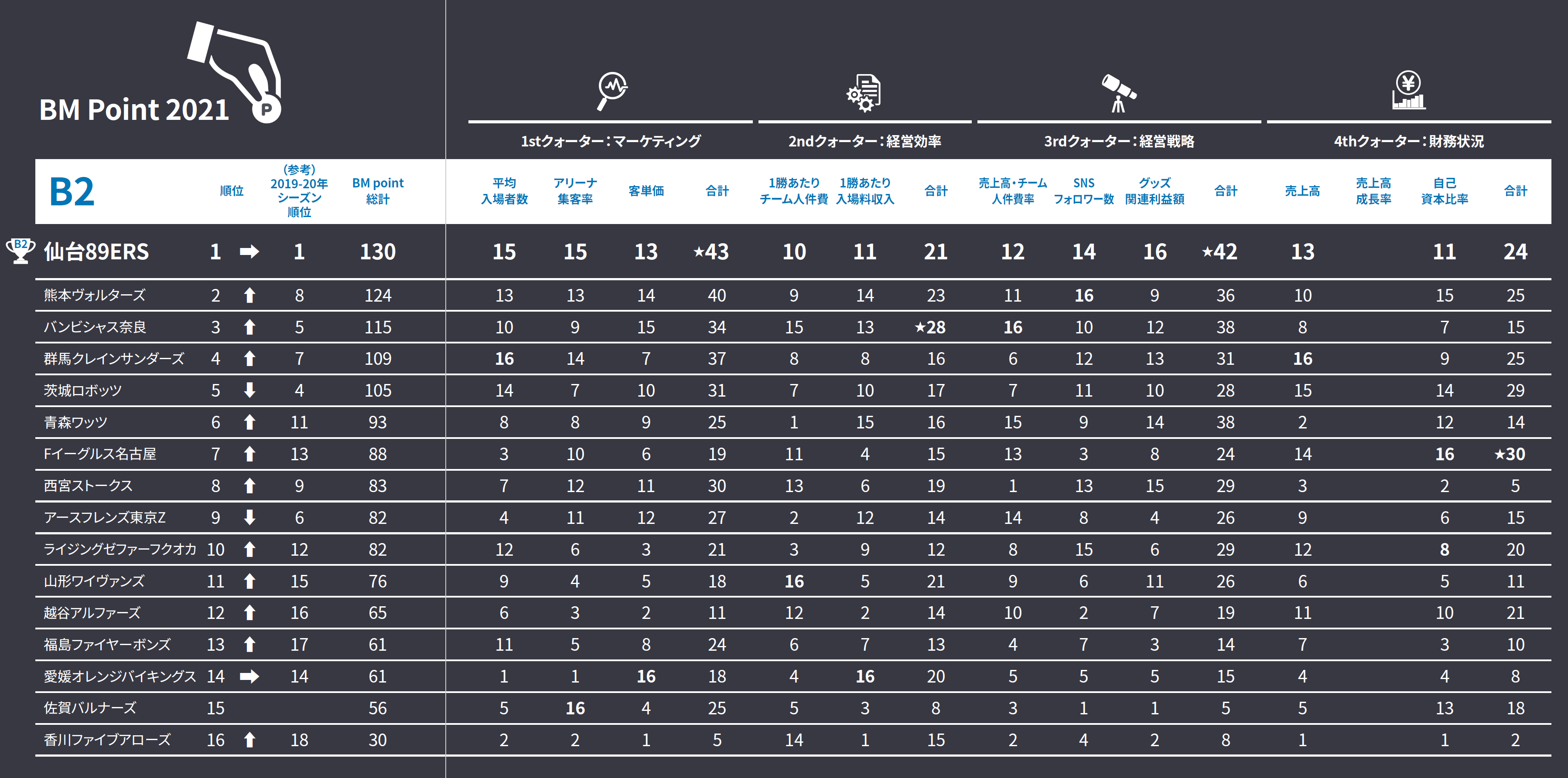 仙台はマーケティング分野と経営戦略分野でともに1位、経営効率分野で3位タイ、財務状況分野で5位となり、2位の熊本に6ポイント差を付けて堂々の3連覇となりました。