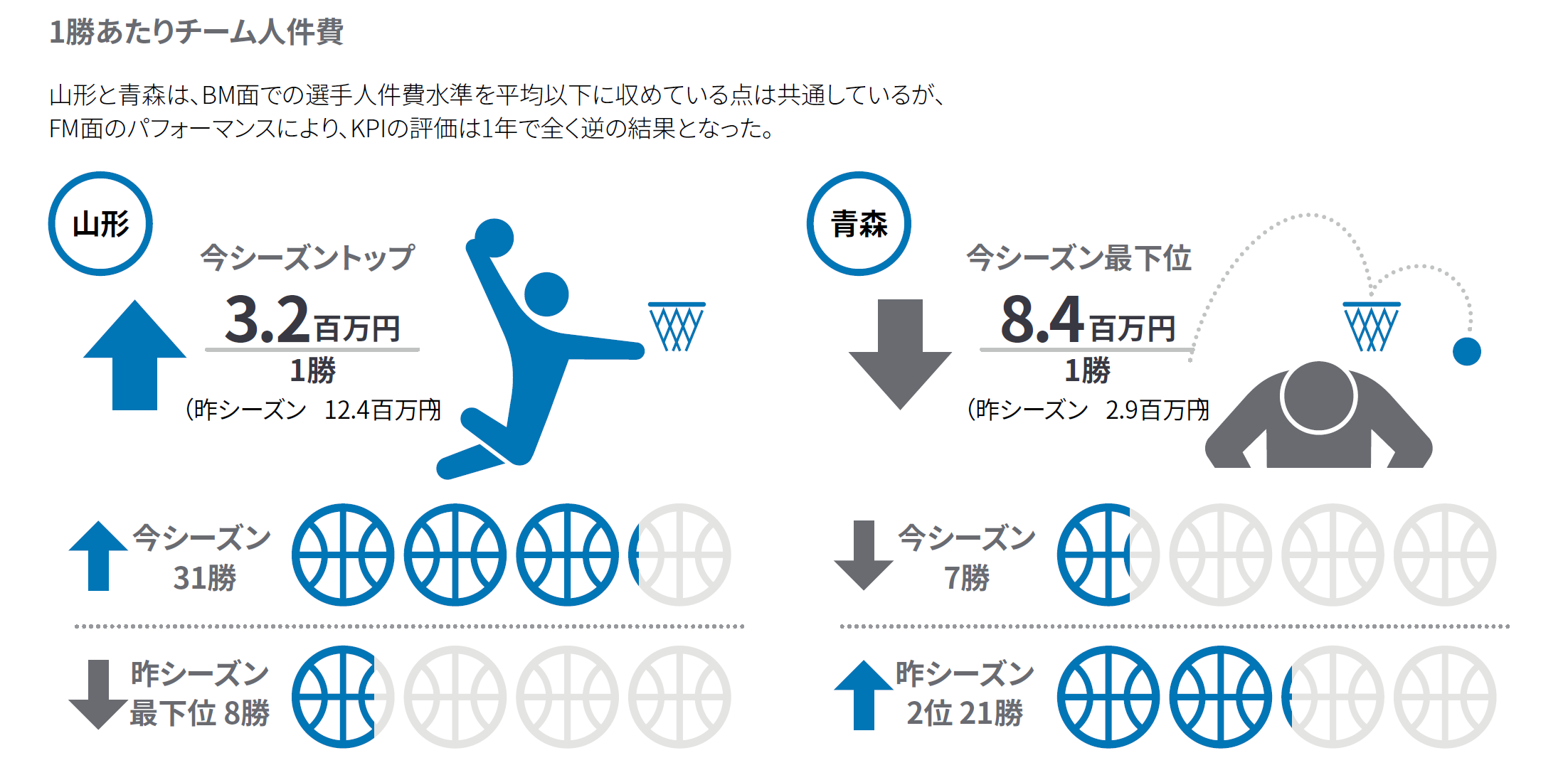山形は、昨シーズンは本KPIが最下位でしたが、昨シーズンと同様にチーム人件費をB2平均以下としつつ、勝率を0.170の8勝から0.517の31勝まで劇的に改善させたことで一躍トップとなりました。一方の青森は、B2最小のチーム人件費でありながら昨シーズンは本KPIで2位と奮闘しましたが、2020年シーズンはB2で最も少ない勝利数(7勝)に留まったことで、パフォーマンスを大きく悪化させてしまいました。