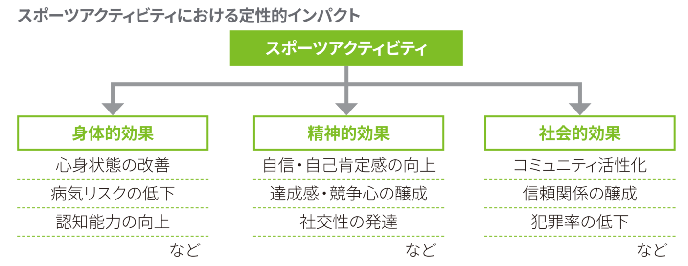 これらの社会的価値はこれまで、受益者に対するアンケート調査や、検診や測定によるデータにより、定性的には把握されてきました。そのため、個人や社会に対してスポーツというコンテンツがポジティブな影響を多く生み出していることについては、それほど議論の余地がないところです。