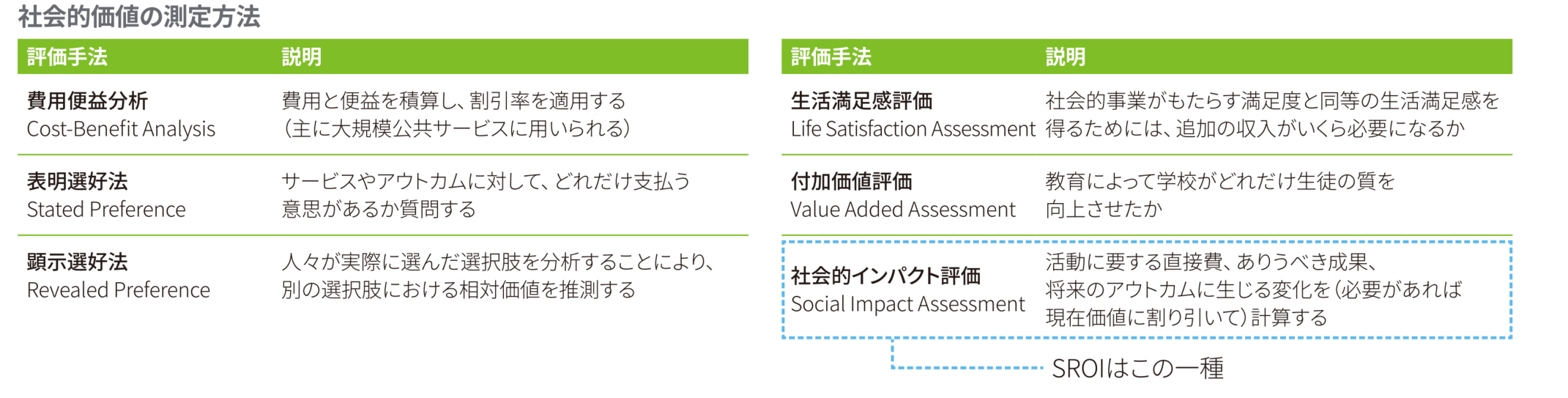 このうち、社会的インパクト評価については、何らかの活動が生み出す価値を金銭的価値で表すことが可能な手法で、現在主流の評価手法となりつつあります。なかでも我々が構造的課題を解決する有力なソリューションの1つになり得るものと考えているのは、SROI評価という手法です。