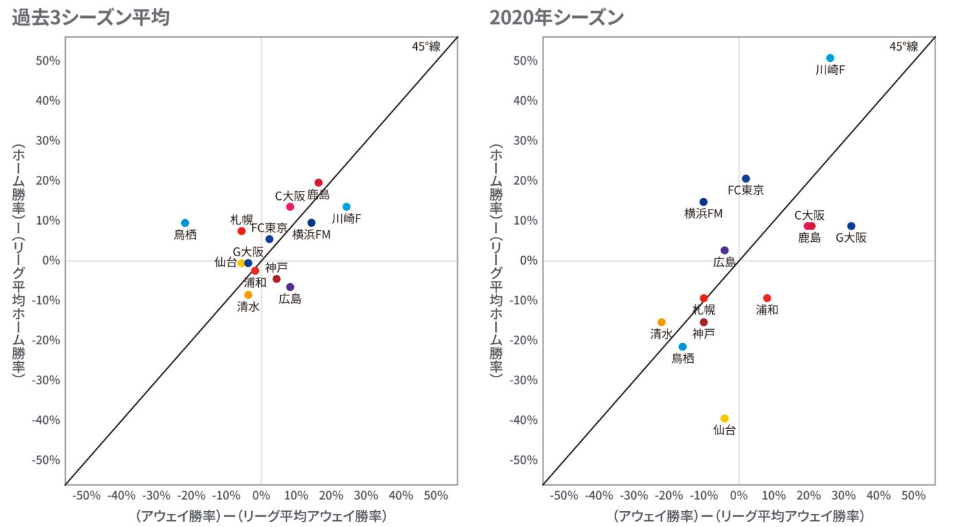 例えば、過去3シーズン平均で右上の位置にいる川崎Fは、2020年シーズンではアウェイの勝率を平均以上に保ったまま、ホームでの勝率を大きく伸ばしていることが分かります。その結果、全体の勝率が非常に高い水準になり、2020年シーズンではリーグ優勝を成し遂げています。