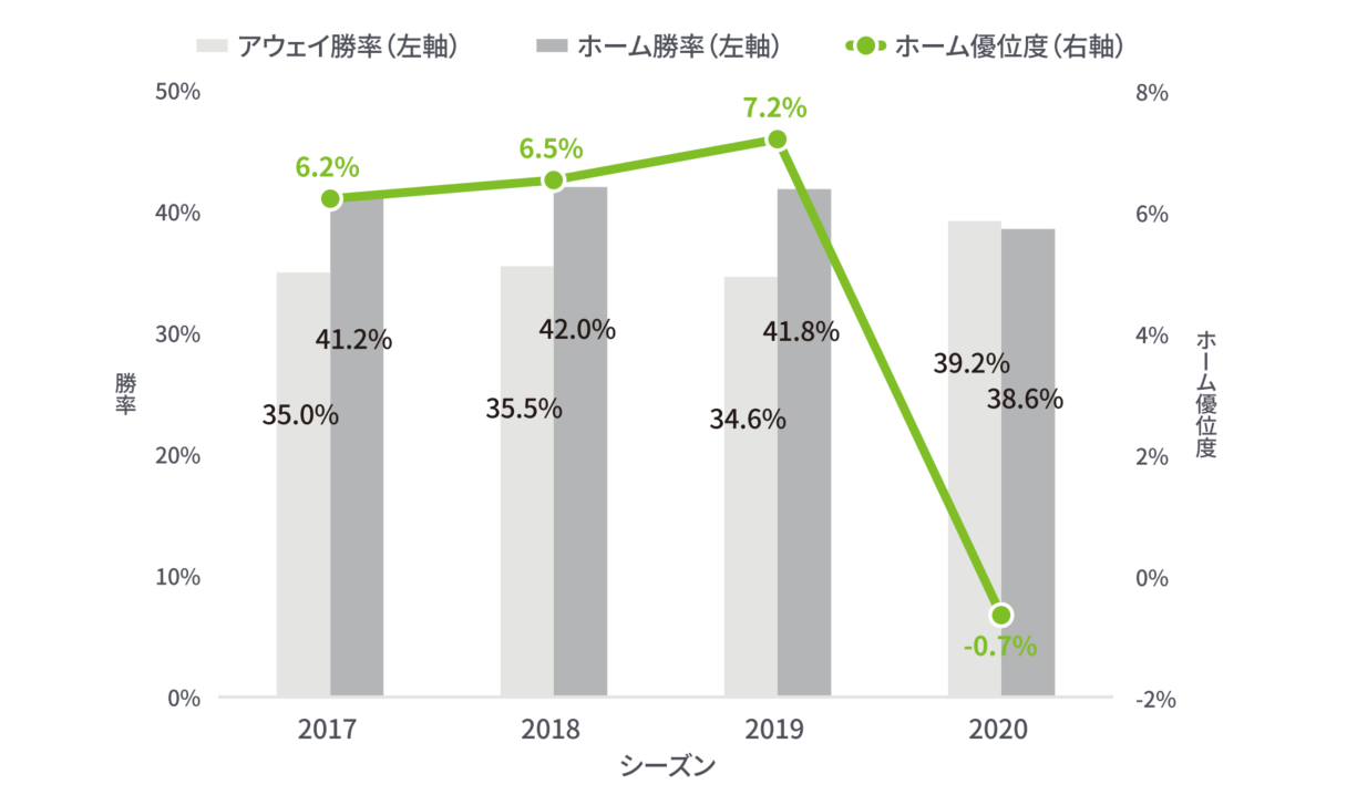 しかし、2020年シーズンに着目すると、ホームの優位度は-0.7%と大きく落ち込んでおり、初めてアウェイチームの勝率がホームチームの勝率を上回る結果となっています。実は、この傾向はJリーグに限らずヨーロッパや南米のプロサッカーリーグでも同様の傾向が確認されています(参考:What about the home advantage after the COVID-19 pandemic?|CIES FOOTBALL OBSERVATORY)。