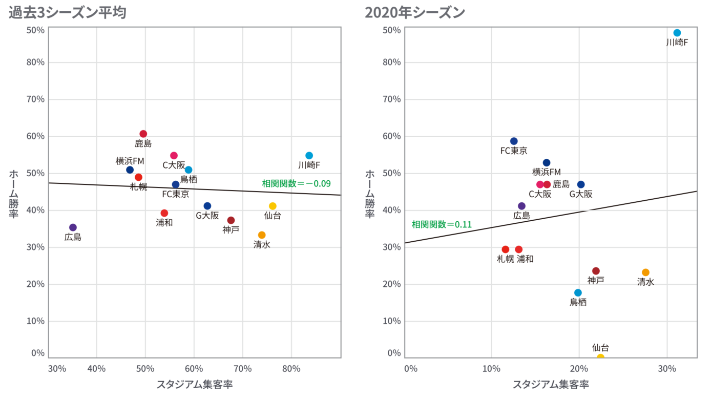 実線で引いている回帰直線を見ると、過去3シーズン平均では負の関係、2020年シーズンでは正の関係になっていますが、そもそもの相関係数がどちらも低いため、リーグ全体で見るとスタジアム集客率はホーム勝率にはあまり関係していないという可能性が示唆されます。つまり、物理的に満員のスタジアムなのか、そうでないのかだけでは、勝率に対する影響はあまり説明できないという結果になります。