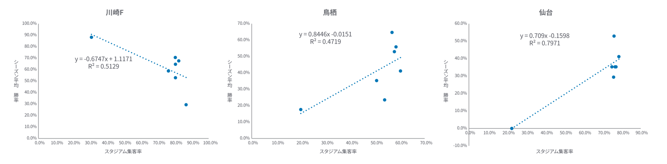 そこで今度は個別のクラブに着目し、例えば2020年シーズンでホーム勝率が顕著に上がった川崎Fと、逆に下がってしまった鳥栖・仙台について過去7シーズンのスタジアム集客率とホーム勝率との相関関係を確認したところ、川崎は負の相関だった一方で、鳥栖と仙台については一定の正の相関が確認できました。(図4)