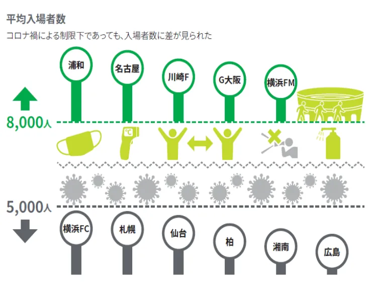 一方で9月19日以降は入場制限が緩和され、最大で収容可能人数の50%まで観客動員が可能となったため、ロイヤリティの高いファン・サポーターが多いクラブや、スタジアム観戦の安心・安全をファン・サポーターとコミュニケーションできたクラブでは一定の観客動員に結び付けられたものと推察されます。