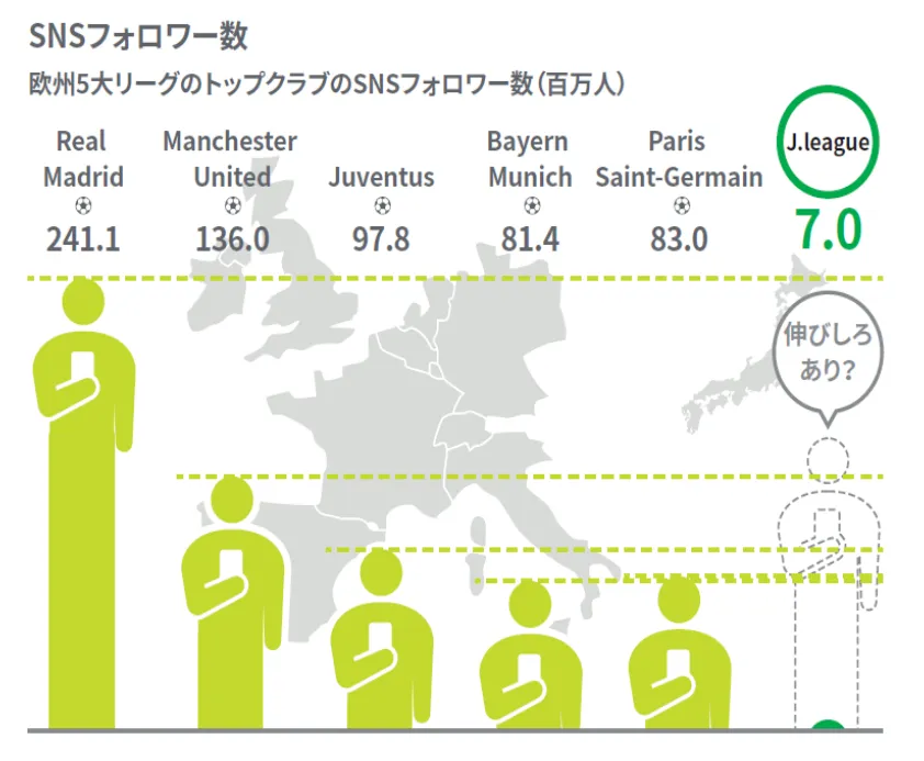 一方で海外とSNSフォロワー数を比較した場合、2020年現在世界最大のフォロワー数を誇るレアル・マドリードは2億4100万人とJリーグ全体のフォロワー数宇を足し上げた数(700万人)でも遠く及ばないレベルとなっています。今後Jリーグが欧州5大リーグに伍するリーグとなることを目指すにあたっては、SNSフォロワー数は大きなテーマとなりますし、伸ばしていかなければならないといえます。