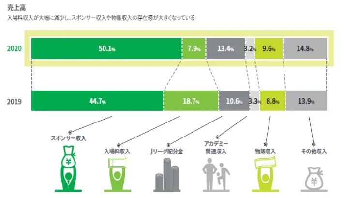 2020年シーズンは、周知の通りコロナ禍による影響で試合日程の変更、観客数の制限など異常事態に見舞われたシーズンでした。満員のスタジアムという印象が定着した川崎にとってスタジアム観戦の制限は大きな打撃でしたが、それでも入場制限上限に近いファン・サポーターが足を運び、またクラブと共に苦難を乗り越えようというスポンサーも多かったようで、ほぼ前年同水準のスポンサー収入を維持できたことが優勝という結果に結びつきました。