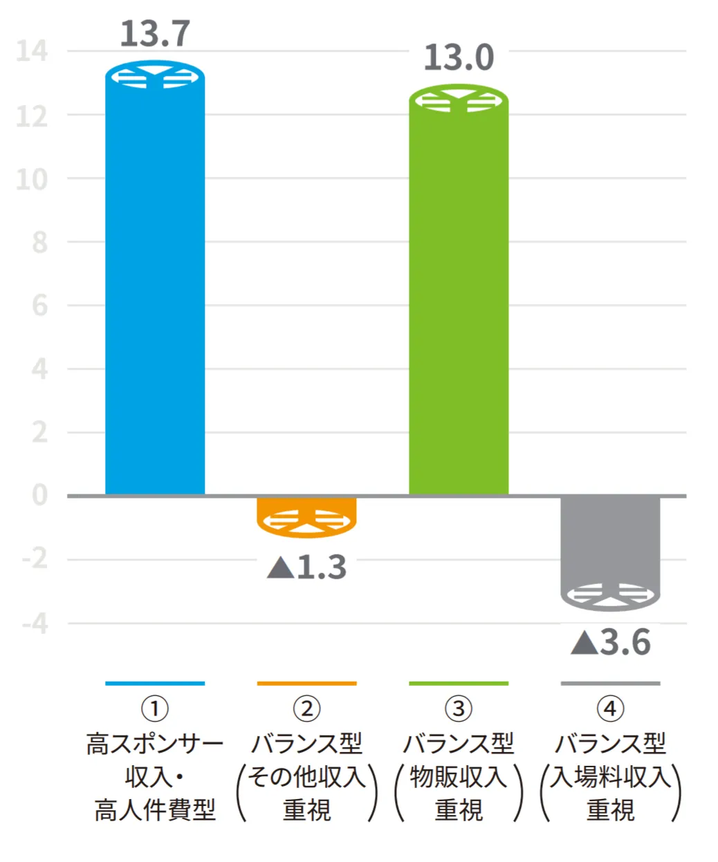 ③バランス型(物販収入重視)は、物販収入(試合会場での飲食・グッズ販売や、オンラインショップでの販売)を多く確保できているクラスターになります。例えば川崎の場合、2018年シーズンよりDeNAの子会社による運営になり、プロ野球チーム横浜DeNAベイスターズでの試合運営ノウハウを生かしたグッズ販売などで、物販収入を大きな収益源として確立することができています。