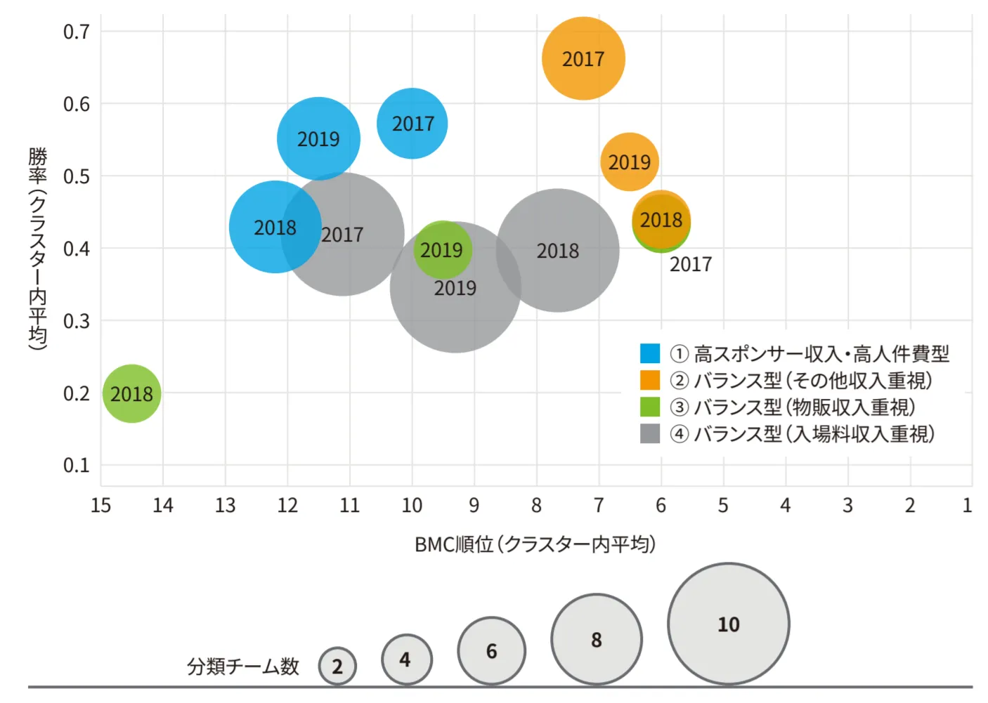 作成した4つのクラスターをもとに、BMとFMの両立度を評価します。図2は、横軸にBMC順位、縦軸にシーズン勝率を設定し、各クラスターの位置関係をシーズンごとにプロットしたものです。ここでの円の大きさはそのクラスターに分類されたクラブの数に対応しています。つまりこの図で右上に行くほど、BMCで評価されるBMと、シーズン勝率で評価されるFMが両立できているということになります。