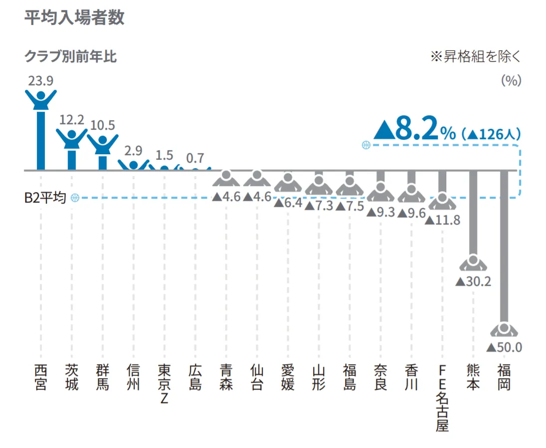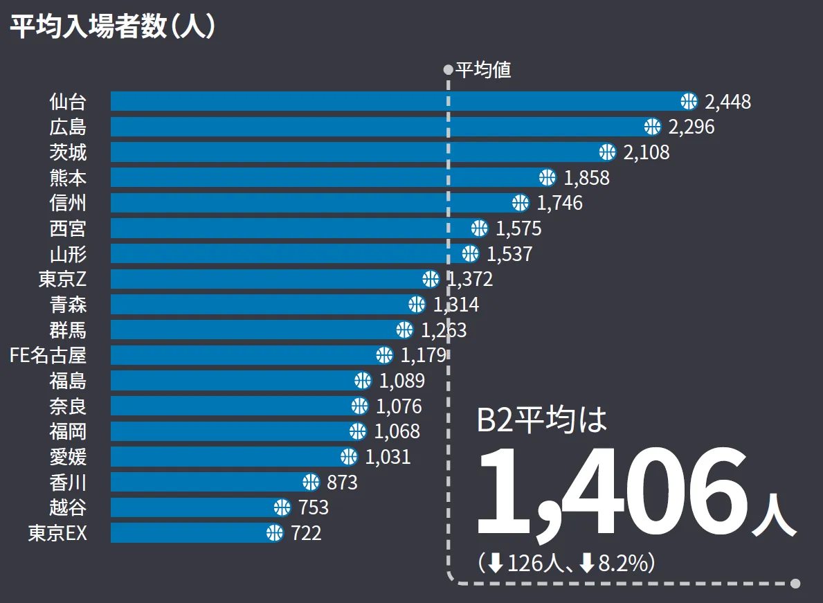 2019年シーズンにおけるB2の平均は前年比▲126人(▲8.2%)の1,406人となりました。トップは仙台の2,448人で、前年比▲119人(▲4.6%)となっています。B3からの昇格組を除く16クラブの内10クラブが前年比でマイナスとなっており、B2として4シーズン目は2年連続のマイナス成長となりました。中でも福岡はB2降格により前年比▲1,069人(▲50.0%)、昨シーズン集客力トップの熊本も前年比▲803人(▲30.2%)と大幅に平均入場者数を減少させています※。