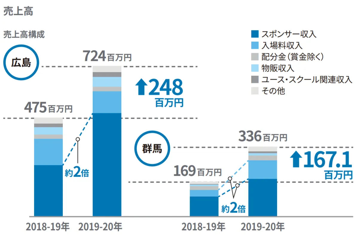 その中で、1億円を超える増加を達成した広島(+248百万円、+52.2%)、群馬(+167百万円、+99.1%)の2クラブがB2全体をけん引している状況です。売上高でトップの広島は、6月決算でコロナ禍の影響を受けながらも、B2クラブで初めて売上高が7億円を超え、高い成長を遂げています。入場料収入こそ昨シーズンから21百万円減少していますが、スポンサー収入の大幅増(前年比約2倍)がそれをカバーする形となりました。群馬も、広島と同様、6月決算でありながら、スポンサー収入+85百万円に加え、コロナ禍前に実施していた集客施策が奏功し、入場料収入も+56百万円とB2クラブの中で唯一増加しています。両クラブは、物販収入、ユース・スクール関連収入などその他収入も伸ばしており、厳しい外部環境下においても、よりバランスの取れた売上高構成を維持していくためのBM施策への取り組みの重要性を再認識させられる結果となっています。