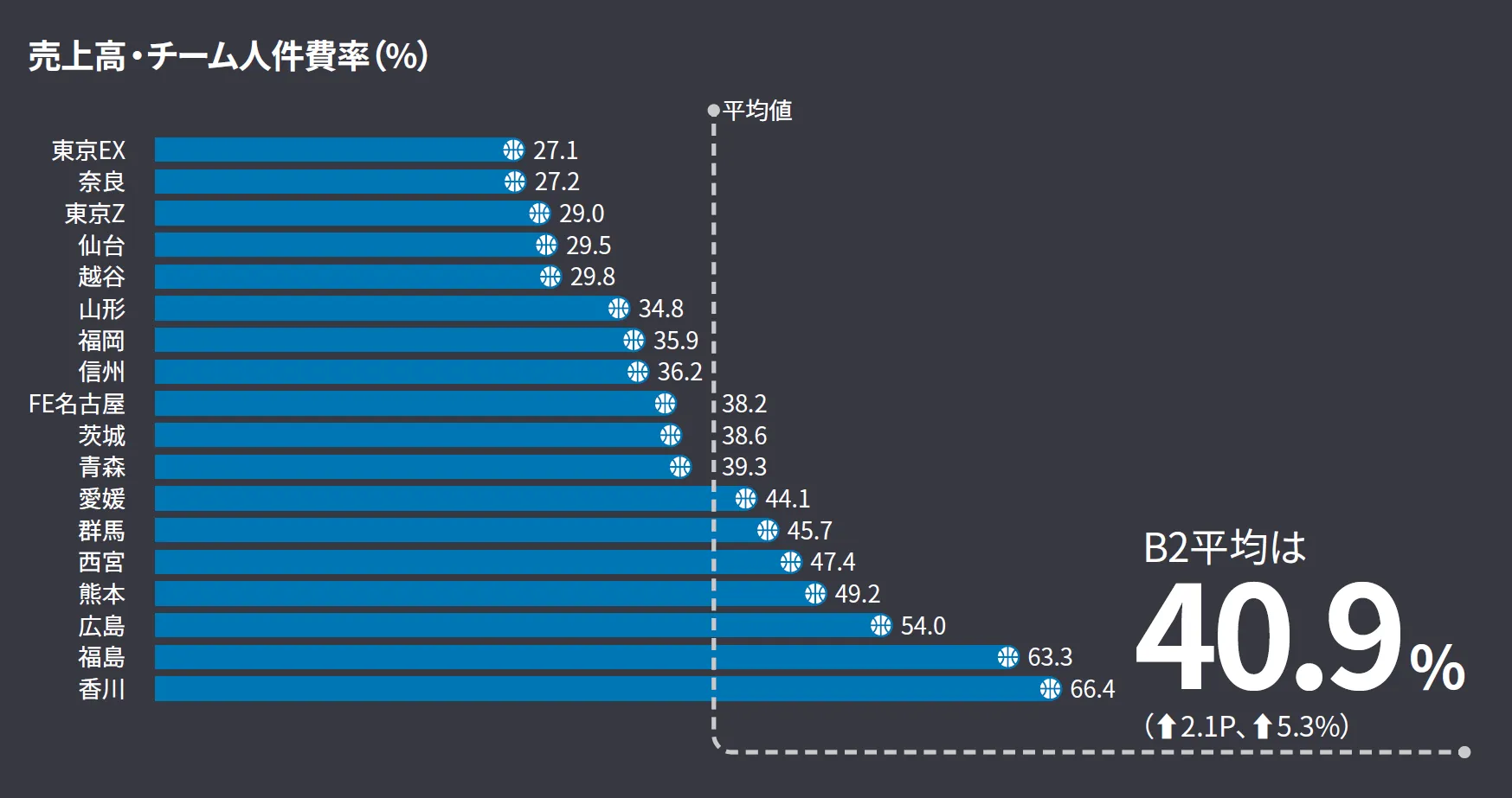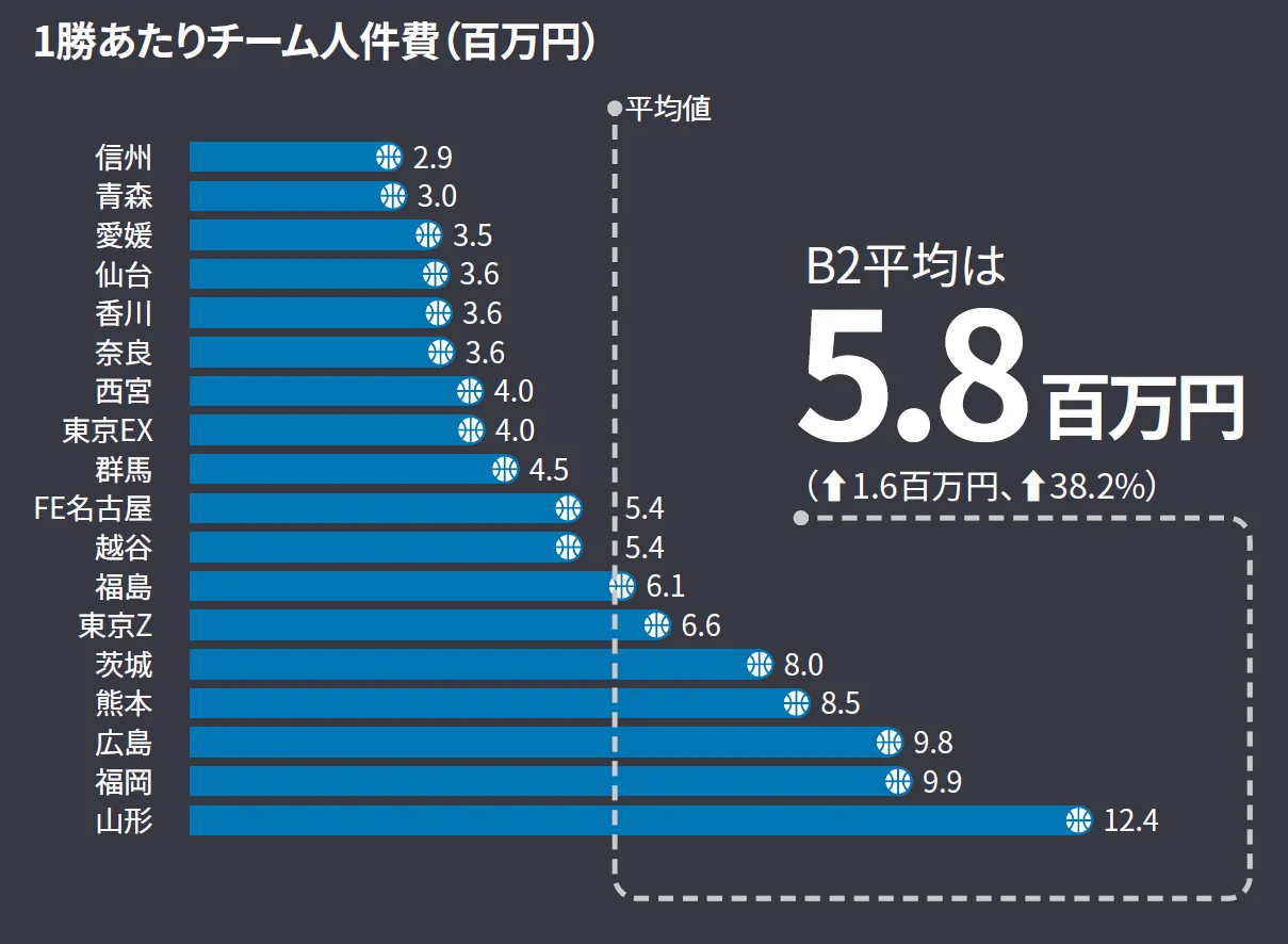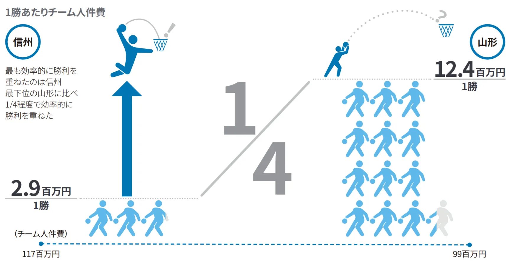 一方で山形も、B2平均を下回る水準のチーム人件費でしたが、B2で最も少ない勝利数(8勝)に留まったことで、BMとFMが噛み合わない結果となりました。