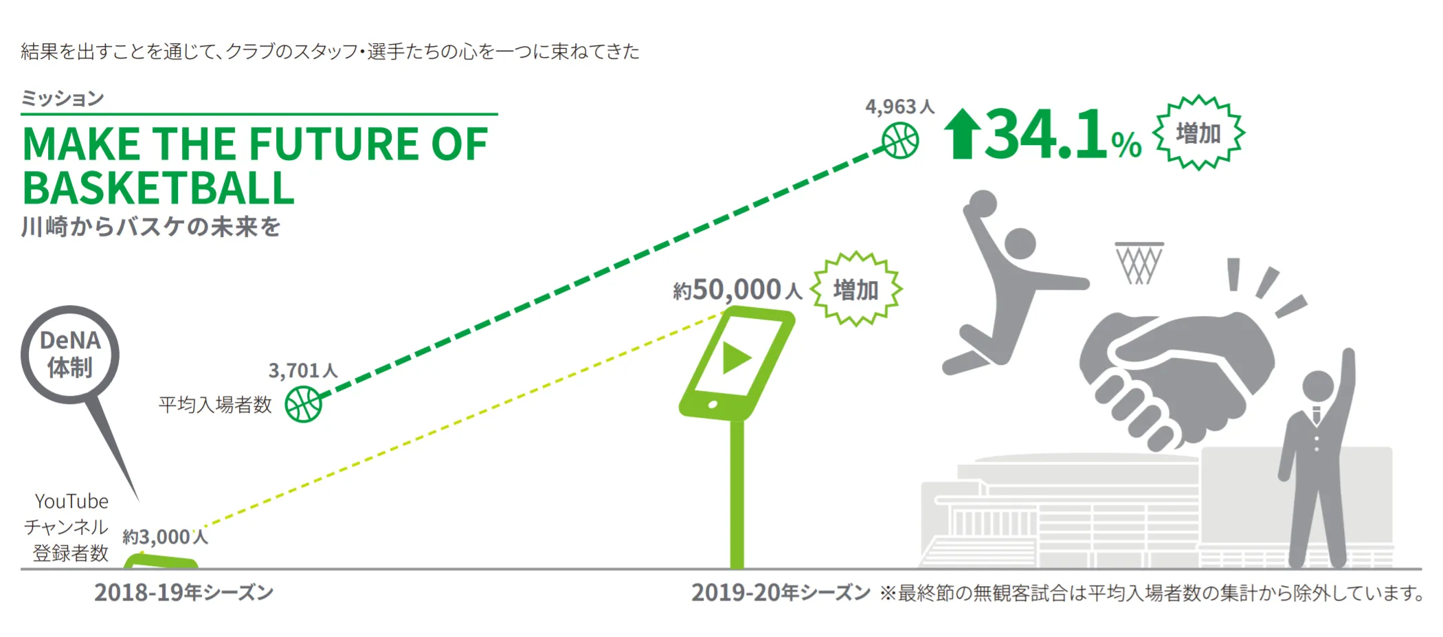 とはいえ、ミッションの達成へ向けて前進している効果を現場スタッフが実感できないままでは、スタッフや選手といつまでも心を一にし続けることは難しいのも事実です。その意味で、死に物狂いに2年間で結果を出したことが大きかったと元沢社長は振り返ります。先述のYouTubeに対しても、選手たちも最初は効果に対して半信半疑でした。しかし、動画が大きな反響を呼び、また実際にアリーナ入場者数が増え、熱狂する空間でのプレーを体感したことが決め手となり、今では「どのようにしたら面白くなるか」を選手たちで考え、提案するまでになっています。