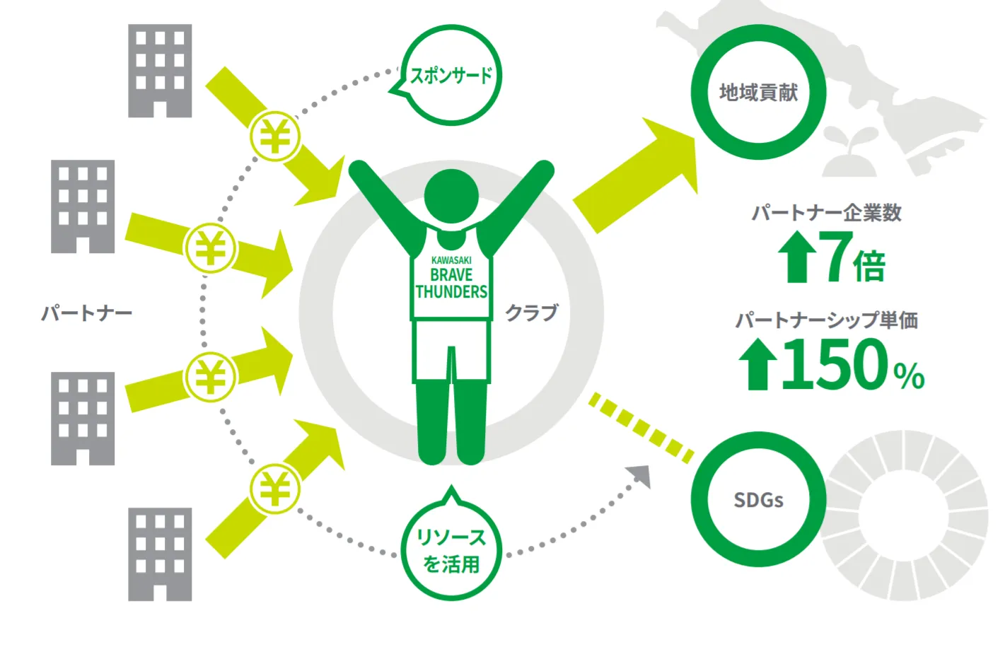 先述の通り、DeNA体制となった当初は前オーナー関係のスポンサーの多くが撤退してしまったことから、極めて厳しい状況に立たされました。しかし、そこから地域企業を中心に必死のパートナーセールスを行い、2019年シーズンのパートナー企業数は昨シーズンと比べて7倍以上に増加しました。さらに、数が増えただけではなく、パートナーシップの単価もまた、昨シーズンと比べて2019年シーズンは+150%と、大きな飛躍を遂げました。