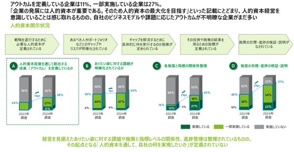 2024年にデロイト トーマツは、TOPIX100構成銘柄企業の有価証券報告書から日本の企業の人的資本投資における情報開示の現状を分析しました。その結果、「企業価値向上のために人的資本の最大化を目指す」という抽象的な目標が記載されていたり、女性管理職比率や男性社員の育休取得率、男女の賃金格差といった義務化された情報のみが多数開示されており、おそらく本来の経営戦略実行のためではなく企業への情報開示の要求に応えている状況です。また取締役会においても、経営戦略の達成に必要な人材を獲得するための議論が十分になされていない可能性を指摘しています。