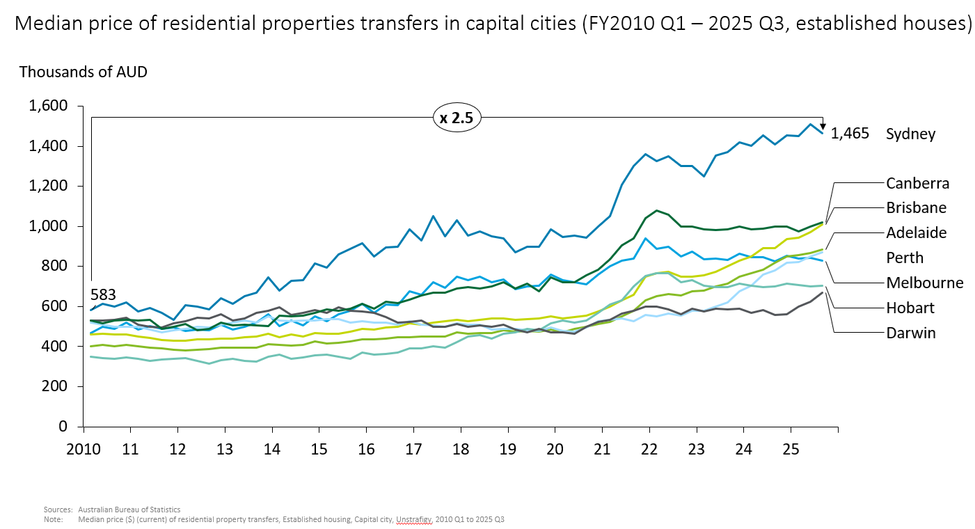 Australian housing prices are rising faster than Japan. In Sydney, for example, the median transaction price of a detached house jumped 2.5 times from about AUD580,000 in 2010 to about AUD1.46 million in the third quarter of 2025 (Figure 1). Why are Australian house prices rising so fast?