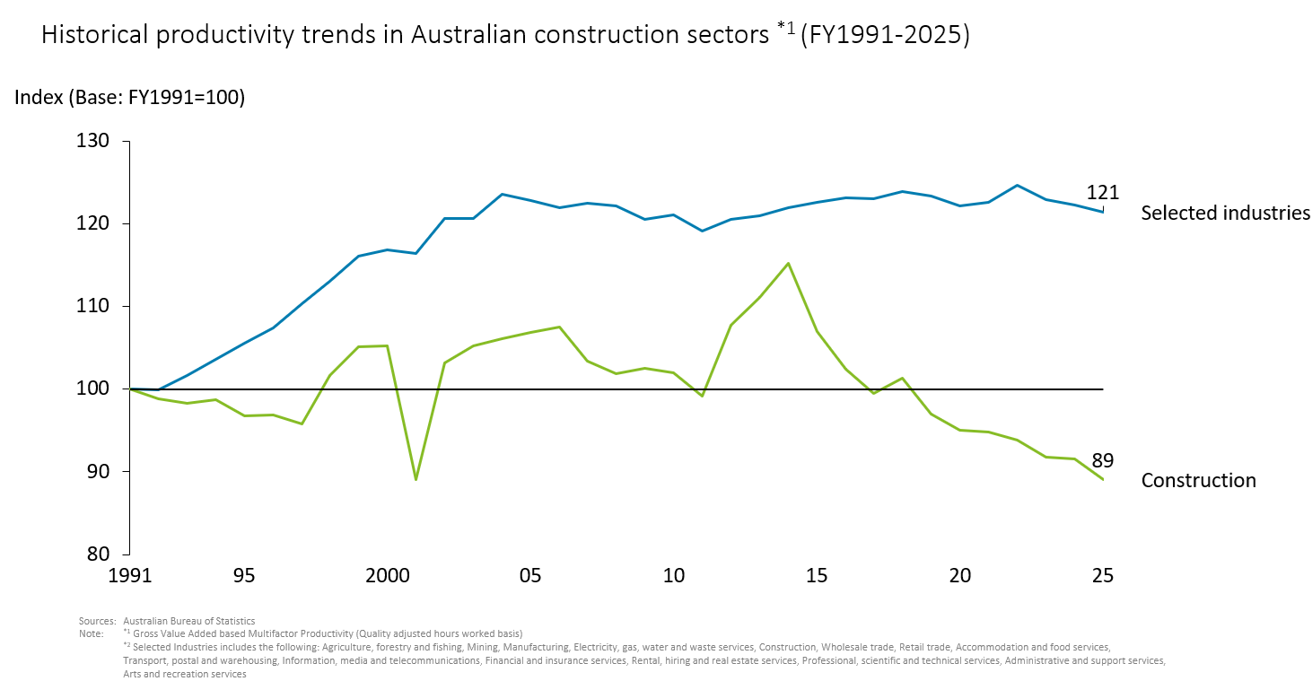 Low productivity in the construction industry has been pointed out as the cause of the sluggish growth in supply capacity in Australia. According to government statistics, when fiscal 1991 is set at 100, the productivity index for selected industries in fiscal 2025 increased to 121, while that for construction decreased to 89 (Figure 2). From the 1990s to the present, productivity has greatly improved across industries, driven by the spread of technologies including computers and the Internet. It is difficult to understand intuitively that productivity went down during this period. Why did this happen? The commonwealth government’s Productivity Commission's analysis identifies several structural factors as contributing factors. [*10]