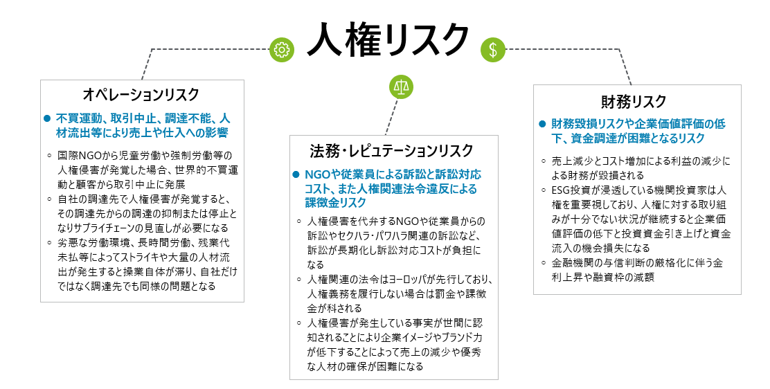 人権リスクに適切に対応しない場合の経営リスクの例を挙げますと、例えば、サプライチェーン上の人権侵害が明るみに出ることで、不買運動などによる消費者購買の減少、取引先の調達基準を充足できないことによる取引停止、海外諸国において製品の輸入禁止措置を受ける等、売上や仕入への影響をきたす「オペレーションリスク」があります。