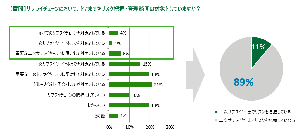 当社が2023年に実施した「人権サーベイ2023」(上場企業を中心に約100社に対し人権意識や各企業の取り組み状況を調査)では、「サプライチェーンにおいて、どこまでをリスク把握・管理の対象としていますか」といった質問に対して、約9割の企業が2次サプライヤーまで人権リスクを把握できていないと回答しました。