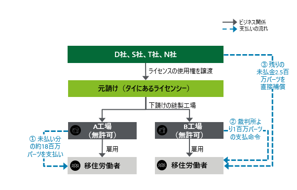 このような状況において、世論から発注元であるトップブランドの各社(D社、S社、T社、N社)においても、サプライチェーン上の労働者に対し未払い賃金の支払い責任を負うべきだといった批判の声があがりました。結果、残りの未払い賃金2.5百万バーツ(日本円換算で約11百万円)については、発注元各社が労働者に対し直接補償を行うこととなりました(図4③)。また、発注元各社は補償対応をより迅速に行うべきであったと、対応への遅れに批判の声が挙げられました。