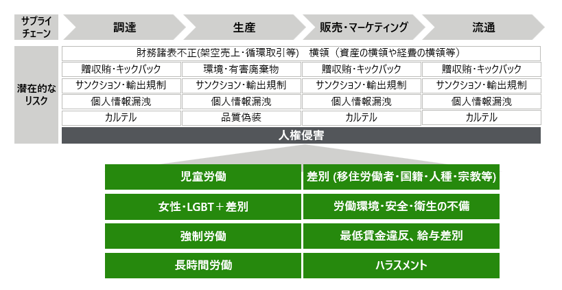 サプライチェーン上の人権リスクは多岐に渡ります。例えばメーカーでは、材料などの「調達」、「生産」、「販売」、「流通」等といった一連のプロセスによって事業活動が営まれますが、「調達」の段階では、鉱物資源の調達時における紛争地での人権侵害への加担といった人権リスク、「生産」では取引先の下請工場による児童労働や強制労働といった人権リスク等、全ての事業活動のステージにおいて、人が関与している限り、人権侵害が起こる可能性があります。そのため、一つのプロセスだけでなく、事業活動の全てのプロセスにおいて、サプライチェーン全体における人権リスクの可視化が求められます。
