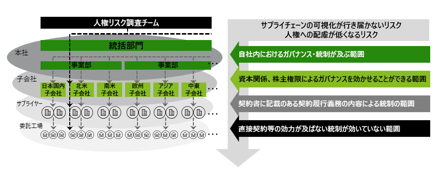 図5は、サプライチェーンの広がりに応じた人権リスクへの統制について示したものです。