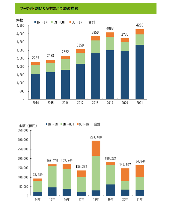 2021年の日本企業によるM&A件数は4,280件と過去最多水準となった。一方、市場別内訳では、IN-IN 3,337件、IN-OUT 625件、OUT-IN 318件であり、IN-IN案件が全体に占める割合が8割程度と過去10年において最も高い水準となった。公表された金額総計は16兆4,844億円であり、うちクロスボーダー(IN-OUT、OUT-IN)案件の占める割合は8割超となった。
