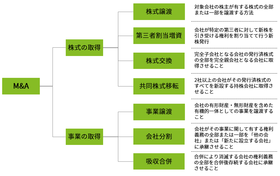 M&A(Merger & Acquisition=統合と買収)と一口に言ってもその形態は様々である。株式を取得することで企業の支配権を獲得する株式譲渡は最も典型的なM&Aの形態であるが、買収対象が法人ではなく企業内の一事業部門である場合には、単純な株式譲渡ではなく事業譲渡や会社分割を経たうえでの株式譲渡の形態をとる。また、経営統合の際には共同株式移転、株式交換、吸収合併などの形態が採用されるケースもある。