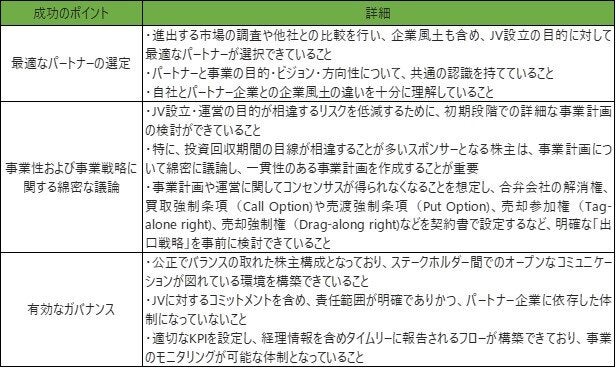 JVは、単一の事業者が行う場合と比較し、様々な関係者の思惑が絡んでくることから、当初想定しない事象が頻発する可能性があります。そのため、JVを成功させることは至難の技ではありますが、「最適なパートナーの選定」「事業戦略の見立ての合意」「適切なガバナンス」の3つを意識することで、JV成功確率を上げられると考えます。