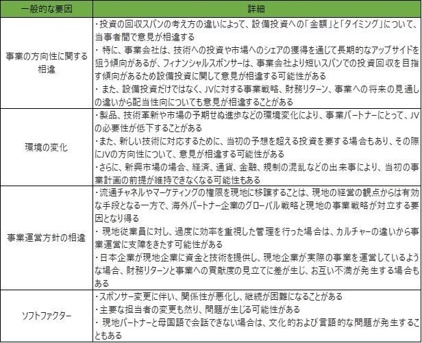 前述の通り、JVの寿命は3年から7年が多く、10年以上存続する事業はわずか1/3といわれており、JVが解消に至るケースは多く存在していますが、一般的なJV解消の要因は、以下が挙げられます。
